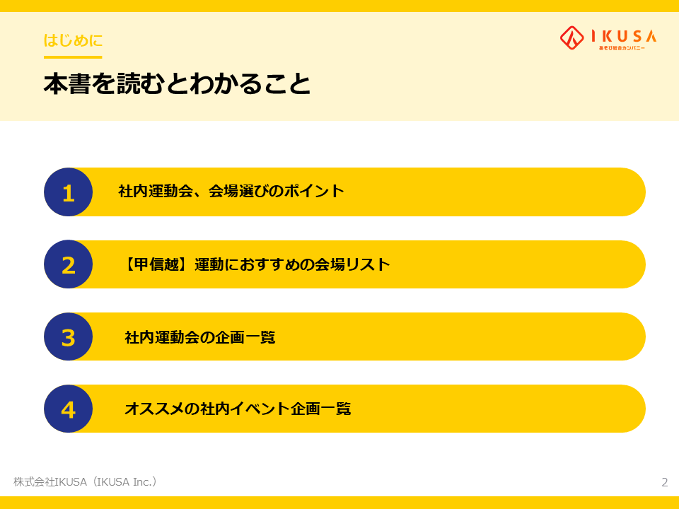 この資料では、運動会会場選びのポイントや、沖縄・九州地方のおすすめ会場、おすすめの社内イベント企画についてご紹介します。